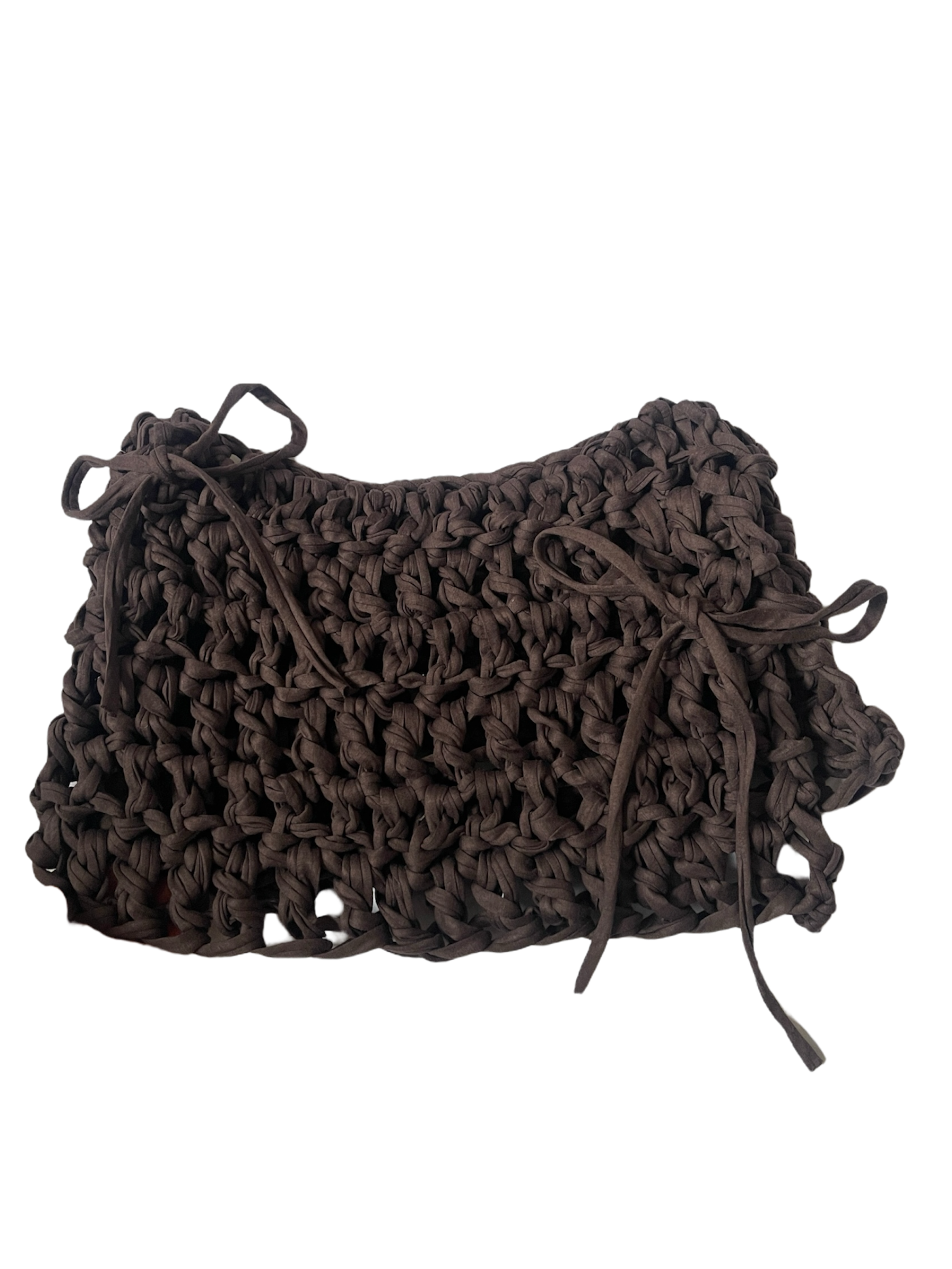 Handmade crochet mini skirt in chocolate colour way with ribbon detailing and an a-line slit, can be worn high waisted or folded down for a y2k low wasted moment!