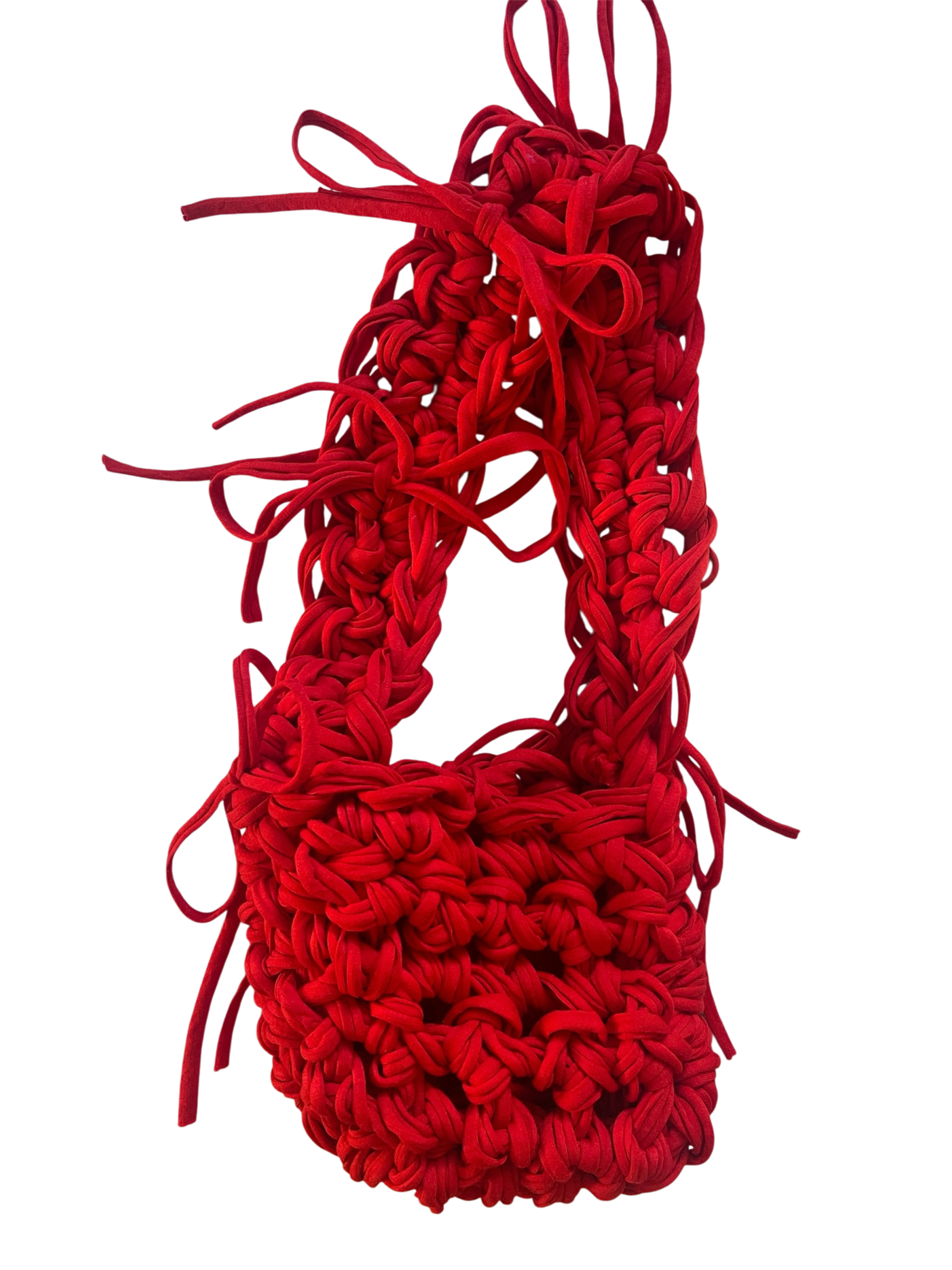 Handmade crochet crossbody sling in bright red shade with ribbon detailing (can be removed)