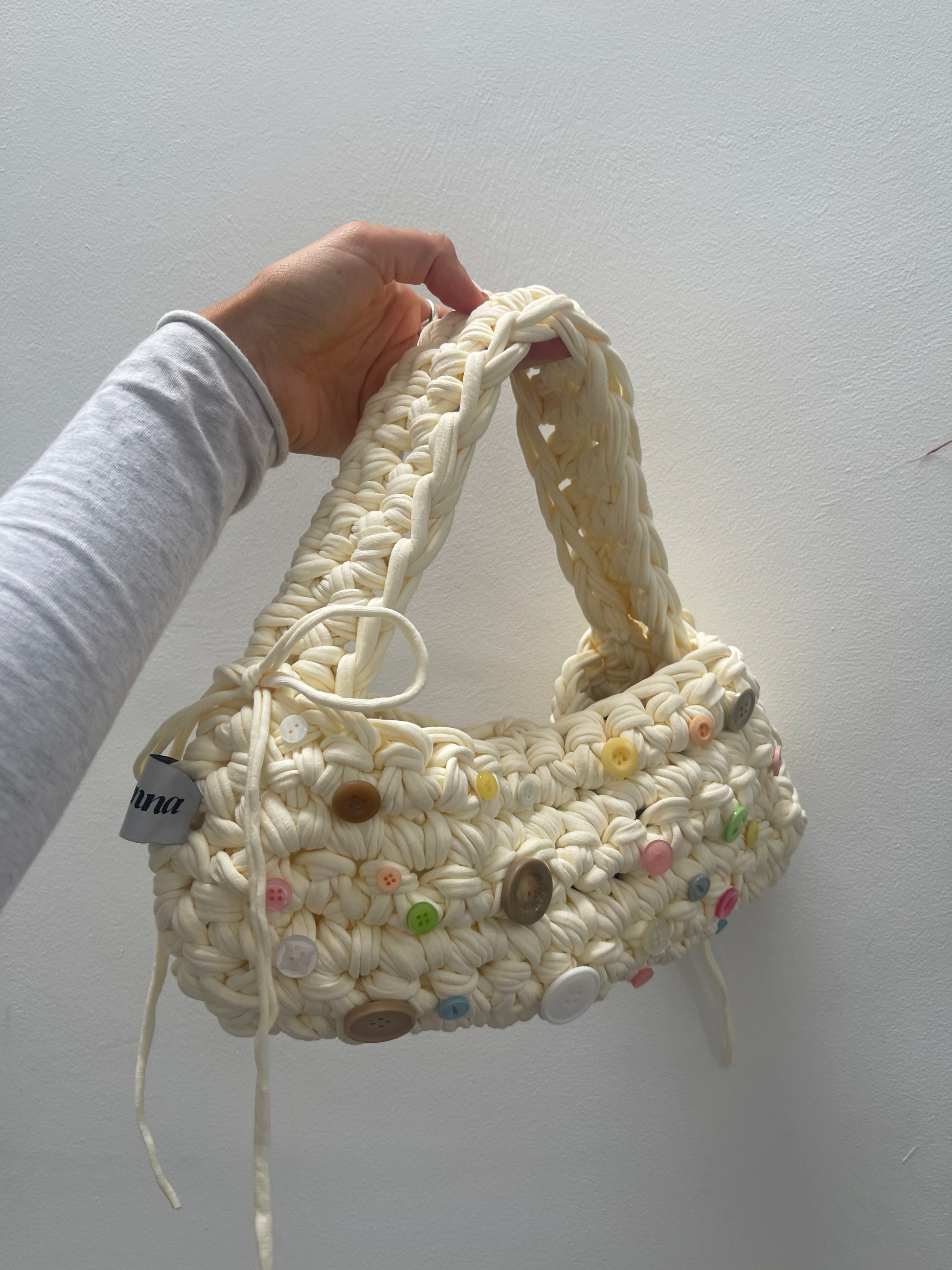Handmade crochet shoulder bag in butter yellow / cream with pearl detailing in Multi